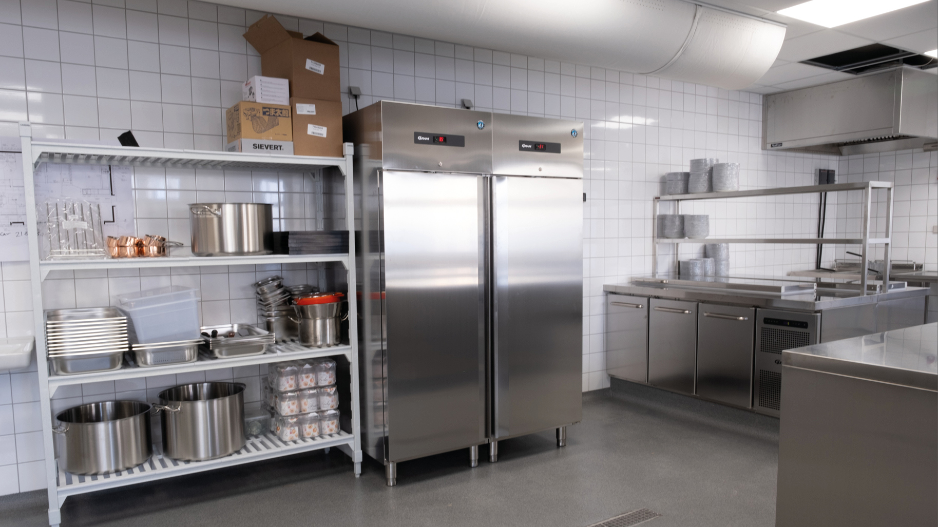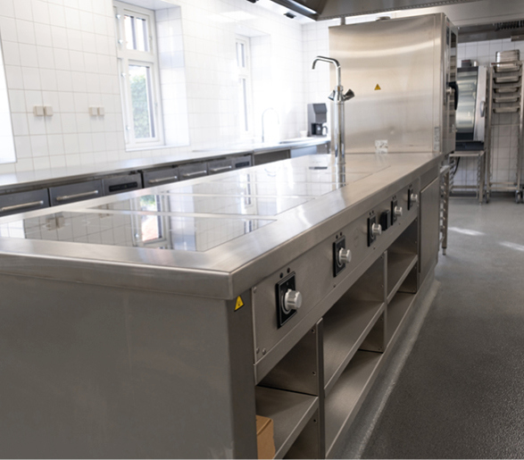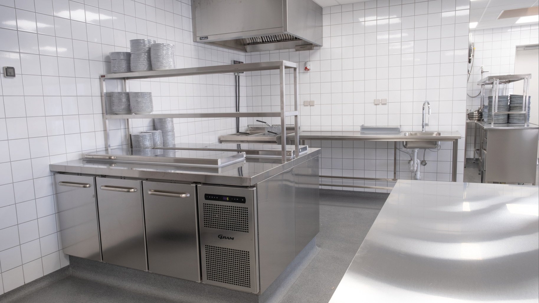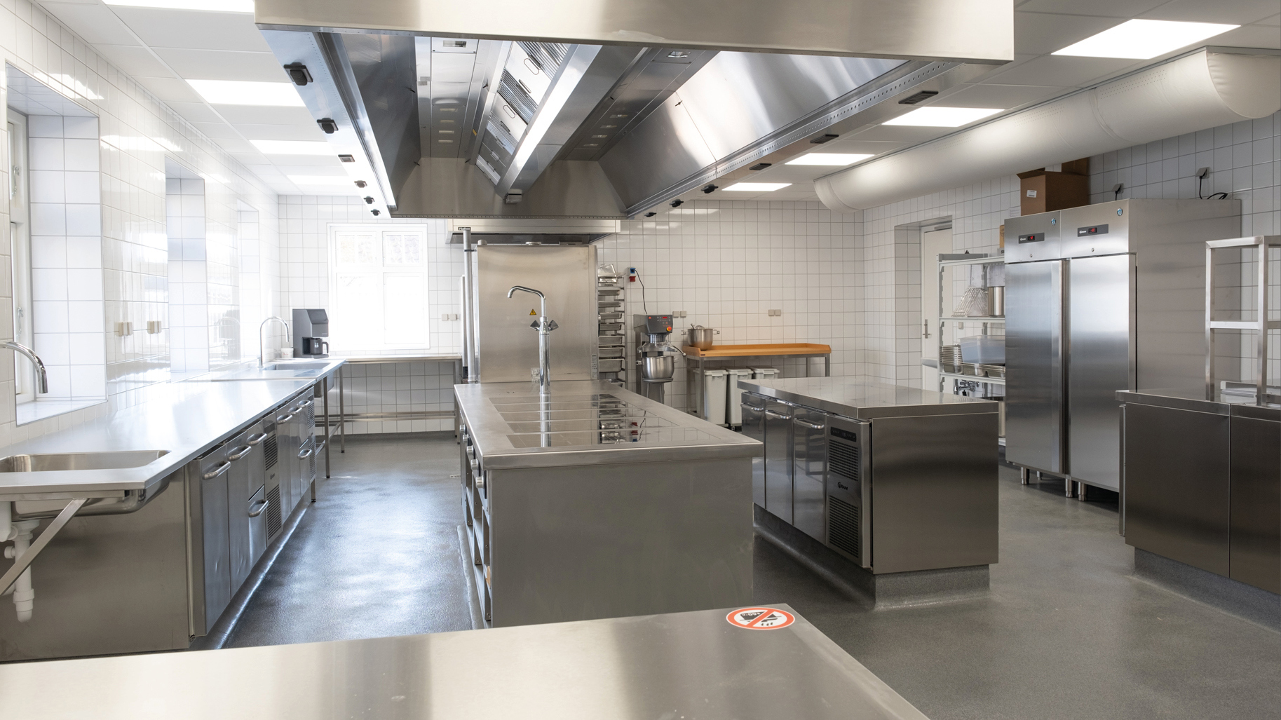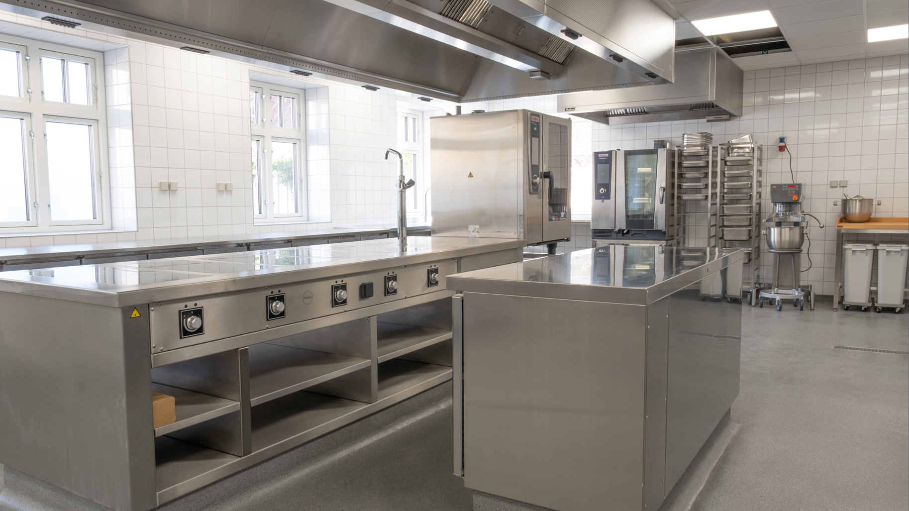 ”Igen er der tænkt i multifunktionalitet, og der er sat to køleborde op imod hinanden. Det giver mulighed for at to medarbejdere kan stå overfor hinanden, og når de står og laver mad til 100 gæster, fungerer det rigtig godt, at de hele tiden er i kontakt med hinanden, og på grund af de to køleborde, er det samtidig nemt at ændre stationen om aftenen”, fortæller Ronni Sørensen, ifølge hvem ventilation, godt arbejdsklima og godt arbejdsmiljø også er vigtige fokuspunkter.