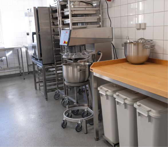 Der er blandt andet installeret en glasopvasker i baren, og det sparer skridt, at glassene kan vaskes, hvor de bruges. Der er rulleborde overalt i køkkenet til at transportere de tunge ting, og der er et rullemodul under Bjørn røremaskinen, så den er nem at flytte rundt i køkkenet.