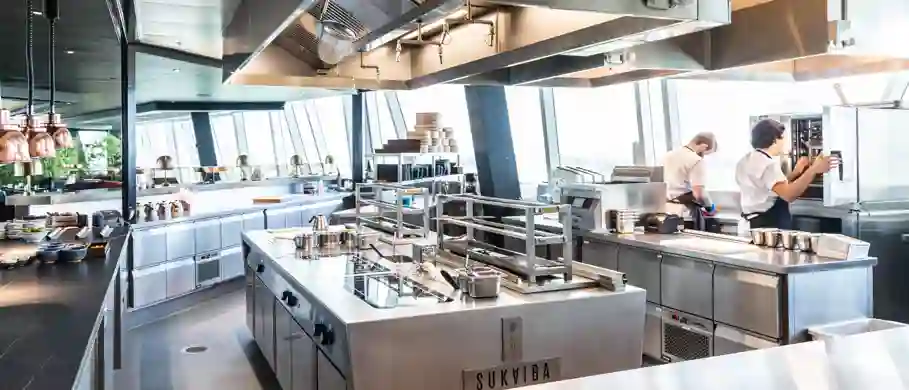 Ud over af få et indblik i menuen, stod det klart at indretningen skulle have et twist af design og være præsentabelt, da køkkenet ligger i åben forbindelse med restauranten. Det var oplagt at vælge et markant komfur, og valget faldt på et håndbygget fra Bertos, og Martin Nilsson-Møller var selv med hos producenten i Italien, og fik lov at konstruere det, som han havde lyst til. Ifølge Carsten Segerlund har projektet - og bla. komfuret været en kæmpe udfordring, for hvordan får du transporteret et komfur, der vejer omkring et halvt ton op til 23. etage. Det lykkedes, men det var nødvendigt at dele en masse ting op, og foretage en del svejsninger på stedet.
